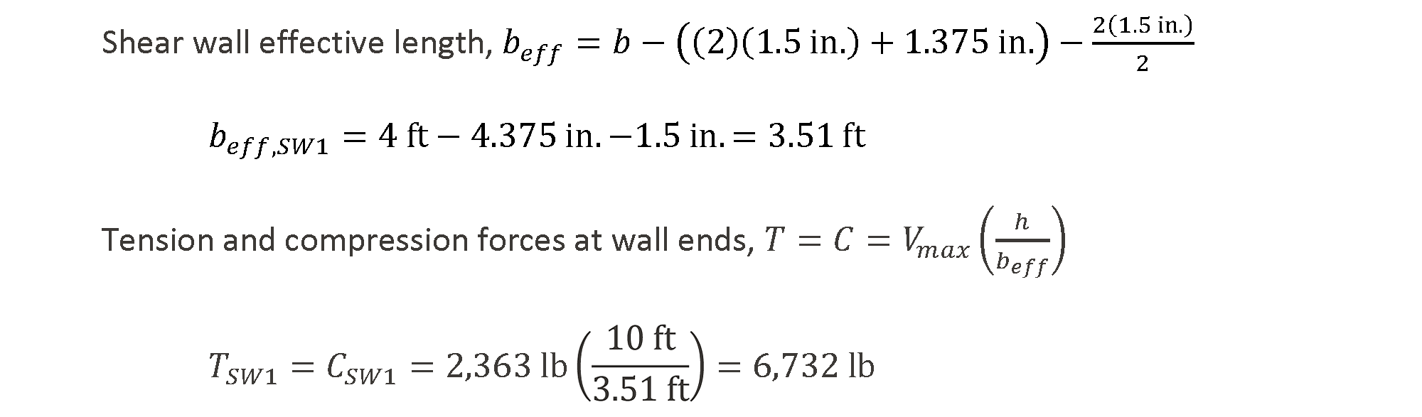 To calculate vertical chord deformation at the wall’s maximum allowable shear load, vASD, the tension (T) and compression (C) forces at the wall ends must be determined. For these walls, the hold-down rod will be 1.375 in. from the inside face of the end post and the compression force is assumed to occur at the center of the end post. Calculations for SW1 are shown, and the same calculations will be required for all wall segments.