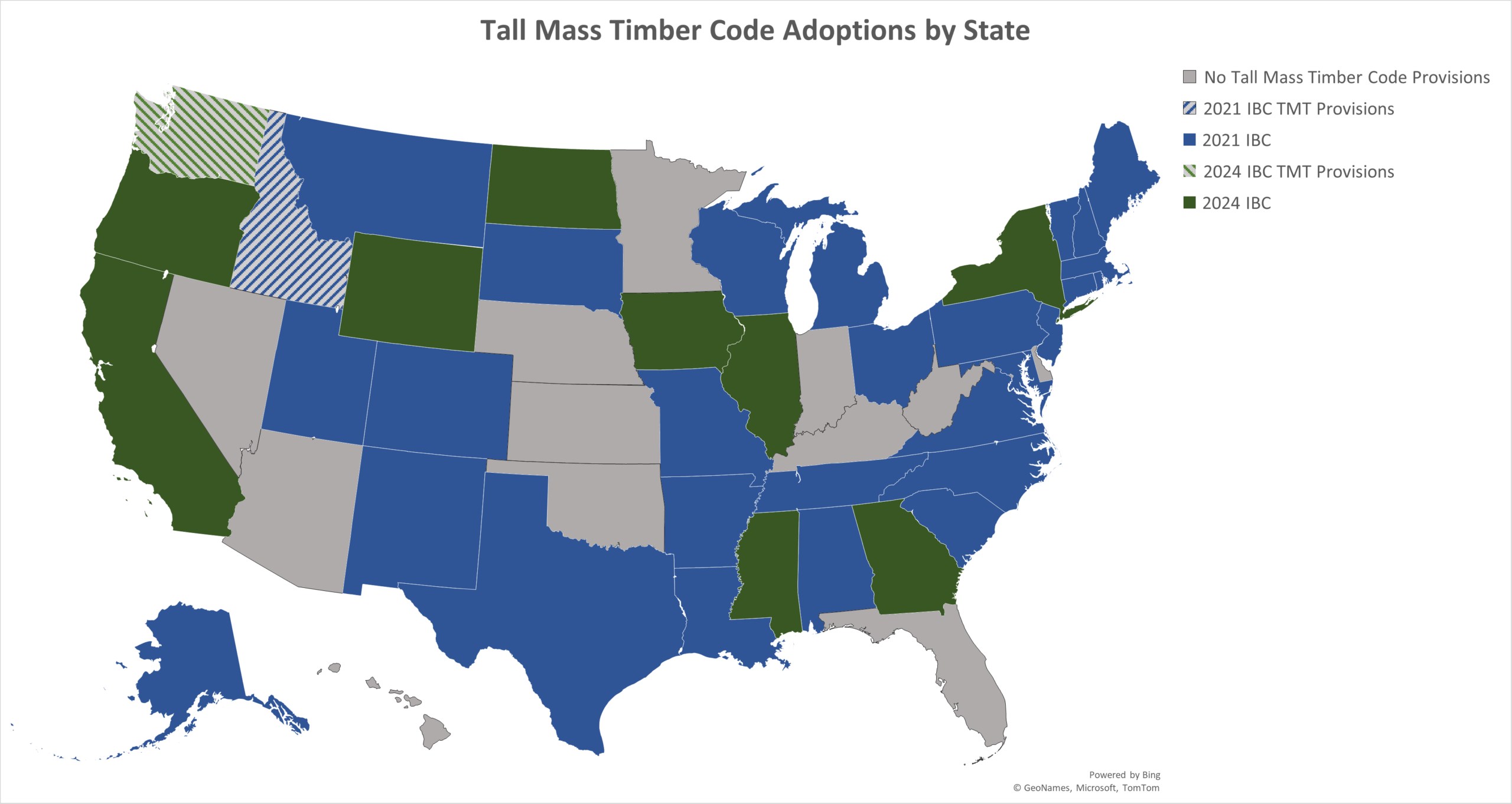 The following states have adopted the tall mass timber provisions of the 2021 and/or 2024 IBC, either whole or with local amendments. Additional local jurisdictions have adopted the mass timber provisions in advance of statewide adoption and it is always recommended to check with the jurisdiction of the project for what requirements apply to planned construction.